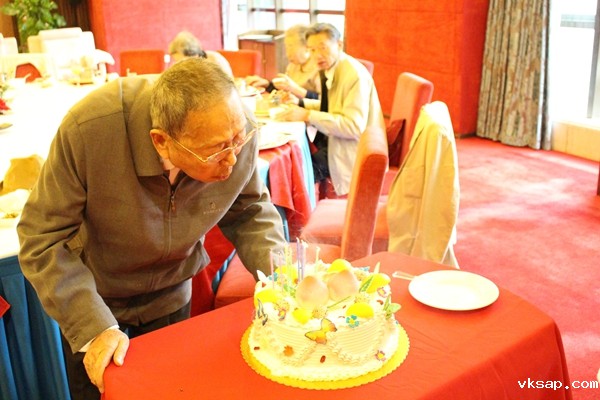 90岁老寿星张承业同志在祝寿仪式上代表所有寿星们吹灭生日蜡烛,并感谢委党委长期以来对离退休同志的关心。