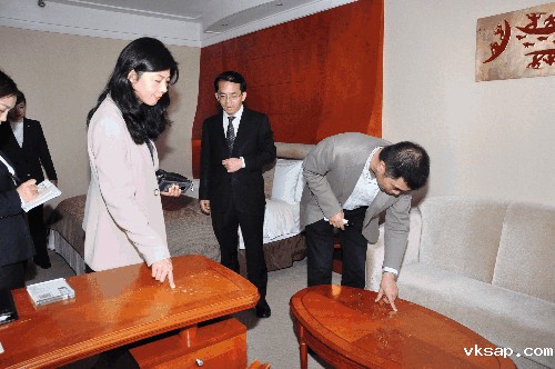 集团领导在酒店班子陪同下,实地察看了酒店前台、客房、餐饮等对客区域后,在三楼春申轩听取了酒店近期工作情况汇报,对酒店实施下一步星评和换牌工作,进行了逐条分析,并提出了具体指导意见和要求。