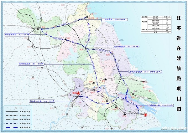 江苏省铁路集团副总经理史良洪介绍,今年年底,徐宿淮盐铁路、连淮扬镇铁路连淮段将同步建成通车。届时,沿线的居民不管是北上京津还是南下沪杭,都会变得更加方便。而在建的连徐铁路、沪通一期、连镇铁路淮安至扬州段、盐通铁路计划于2020年底建成通车。届时,江苏省铁路建成通车总里程将达4200公里,其中高速铁路1800公里。 “北接陇海、南至沪宁、西联京沪、东启江海”的“三纵四横”高速铁路网基本建成,铁路跨江和互联互通能力大幅提升,基本形成设区市到南京2小时的高铁交通圈。