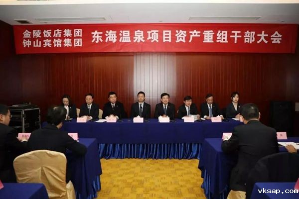 12月17日,金陵饭店集团、钟山宾馆集团在江苏省福如东海温泉大酒店召开干部大会,宣布钟山宾馆集团将所持东海温泉项目(福如东海温泉大酒店、钟山置业公司)全部股权以资产重组方式注入金陵饭店旗下国信酒店集团及领导班子职务调整决定。金陵饭店集团党委书记、董事长狄嘉,钟山宾馆集团党委书记、董事长朱银生,金陵饭店集团总经理胡明出席会议并讲话。钟山宾馆集团党委副书记、总经理郑海龙主持会议。金陵饭店集团党委委员、副总经理陈亮,钟山宾馆集团党委委员、工会主席胡洪平分别宣布东海温泉项目领导班子任免决定。