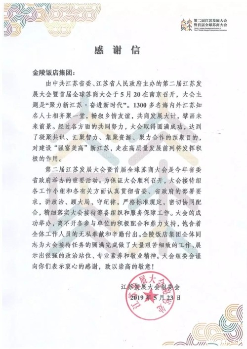 近日,江苏发展大会组委会向金陵饭店集团公司发来感谢信,对集团及所属企业在大会服务保障过程中作出的突出贡献表示衷心感谢。