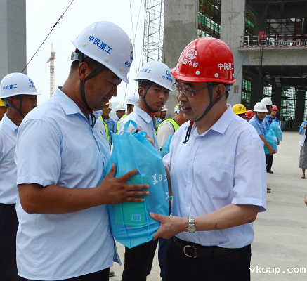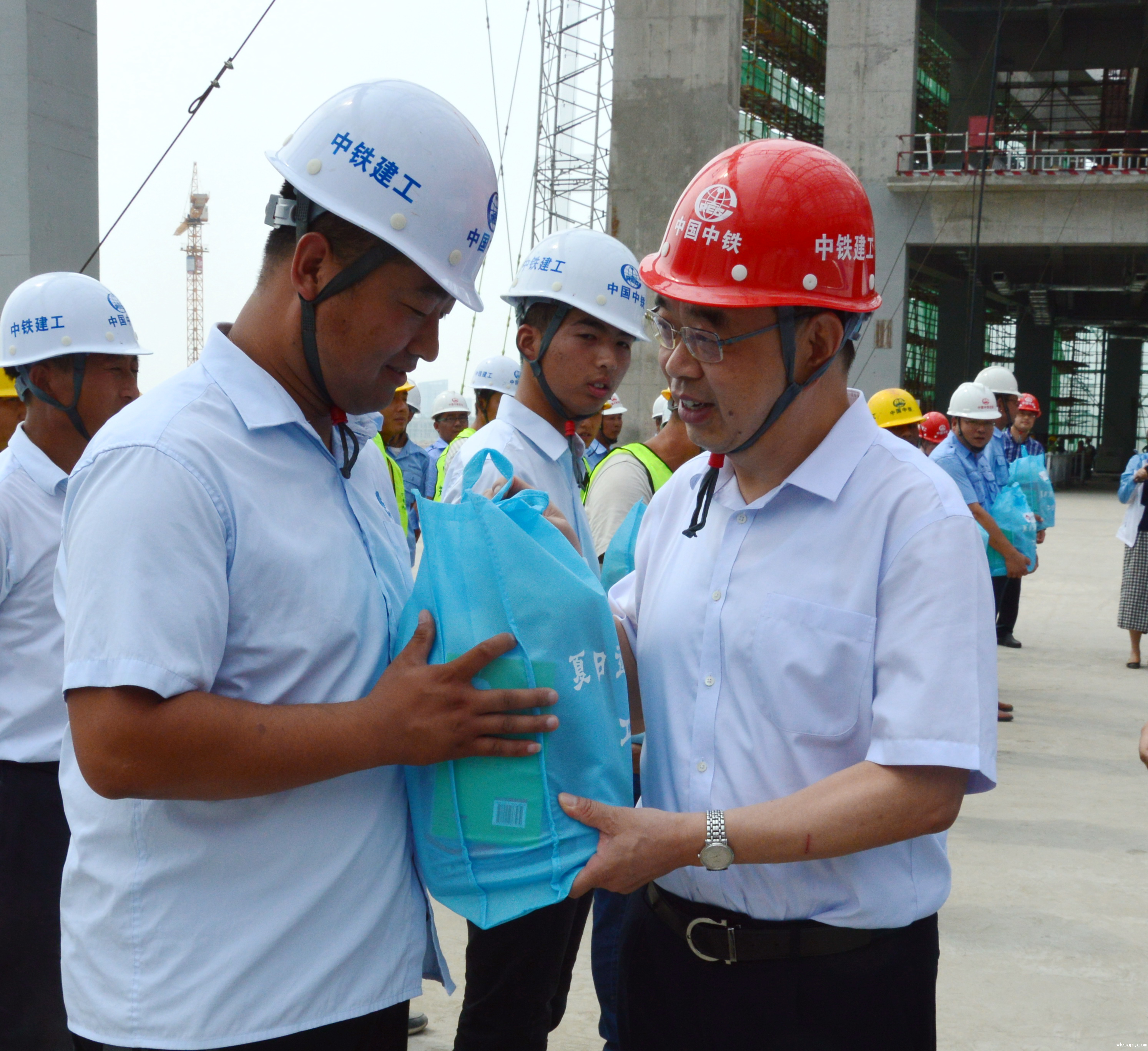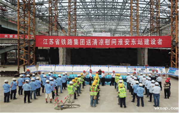 7月16日,江苏省铁路集团党委副书记、总经理丁建奇,集团副总经理史良洪一行冒着炎炎酷暑来到徐宿淮盐高铁淮安东站建设工地慰问建设者,淮安市副市长赵权参加慰问。