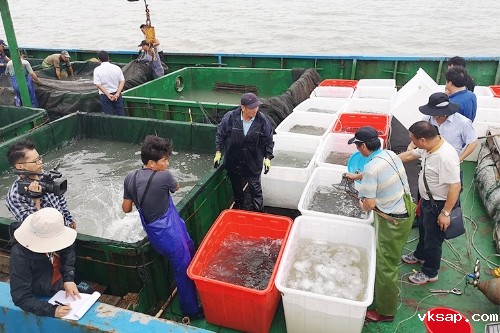 上午8时,东台公司、东台市农业农村局、公证处等部门负责人和渔业技术专家及渔民代表乘船从如东太阳岛重件码头出发,10时抵达东台市145渔区,2019年度增殖放流活动正式开始。省海洋渔业指挥部、省渔业技术推广中心、东台市渔业技术站的专家对苗种品种、规格、数量及质量等指标进行现场检查、严格把关,保障放流苗种质量安全。随后,工作人员将超过860万尾的大黄鱼和大黄鱼标志鱼苗种投放大海,苗种金额达450万元。