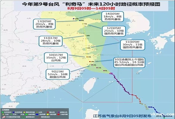根据天气预报,今年第09号台风“利奇马”将于10号凌晨从浙江登陆并影响江苏。受其影响,9日-11日,江苏中东部大部分地区将有大到暴雨,部分地区可达大暴雨;淮河以南地区陆上风力可达7-8级,阵风10级,其它地区陆上风力可达6级,阵风7-8级,江河湖海面风力可达9-10级,阵风12级左右。今天上午,江苏省防指升级防台风应急响应至Ⅲ级。