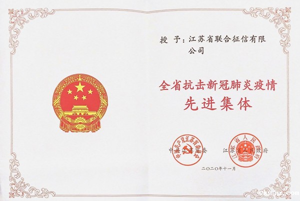 11月26日,全省抗击新冠肺炎疫情表彰大会在江苏省大剧院举行,省联合征信公司受到省委省政府的表彰,荣获“全省抗击新冠肺炎疫情先进集体”荣誉称号。