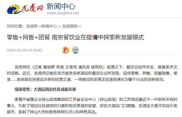 3月10日,市重点新闻门户网站龙虎网在首页重点报道集团所属江苏省会议中心、江苏饭店的餐饮经营新模式。