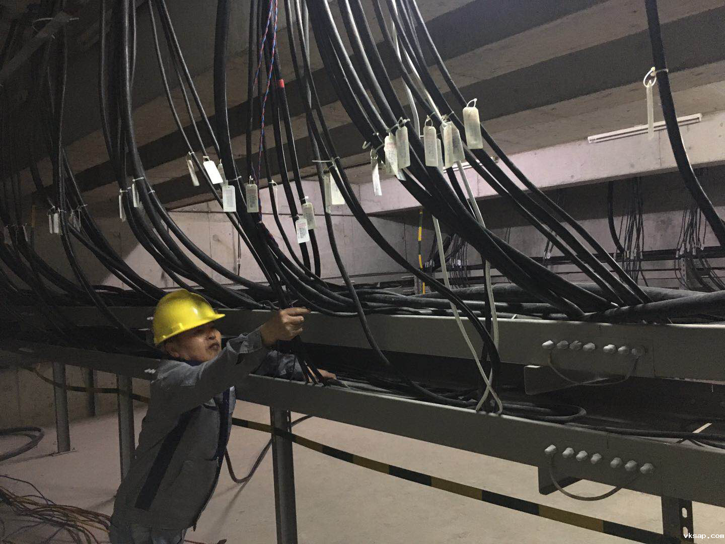 刘老涧二站的电缆整改人员,在如此炎热的三伏天里,身穿长袖长裤钻到电气柜中或爬到桥架下拆卸相应设备桩头,工作服从里到外、从早到晚都湿哒哒的粘在身上。