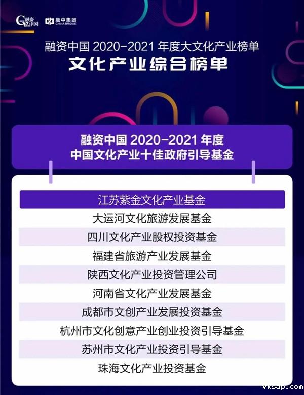近日,“融资中国2020-2021年度中国大文化产业榜单”正式发布,江苏紫金文化产业发展基金再度荣获“中国文化产业十佳政府引导基金”,管理公司毅达资本也同步荣获了“中国文化产业最佳投资机构”“中国数字传播行业最佳投资机构”等多项大奖。