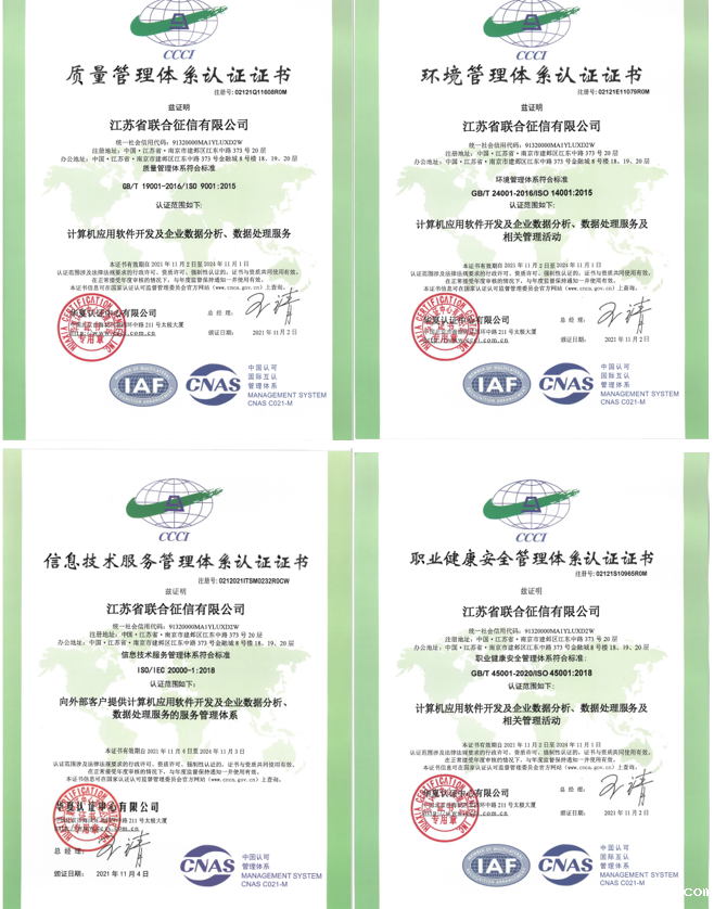 为进一步规范公司业务流程、强化品质管理、提高企业效益,形成标准化经营、规范化管理的模式,省联合征信公司继通过ISO27001信息安全体系认证之后,于今年3月启动ISO9001质量管理体系、ISO14001环境管理体系、ISO45001职业健康安全管理体系、ISO20000信息技术服务管理体系四个体系的建设工作。10月底,华夏认证中心审核专家组通过现场询问、查看和抽样方式等形式,对公司进行了严格的体系建设情况认证审核,最终一致通过了公司的注册资格认证,并于2021年11月正式颁发了认证证书。
