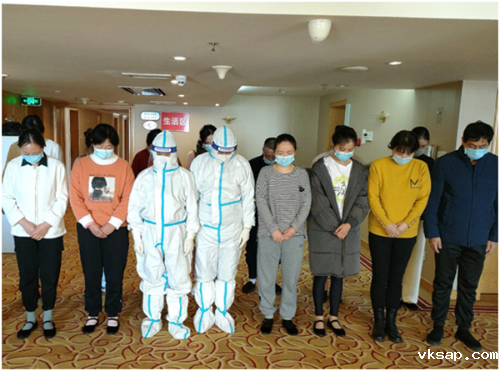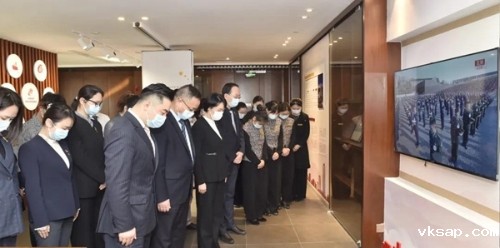 上海金陵紫金山大酒店通过降半旗、默哀的形式祭奠84年前的30万遇难同胞,酒店所有人员在旗杆处默哀。仪式结束后,酒店三个党支部通过多媒体频道观看直播,以“铭记历史、祈愿和平”为题分别组织在支部群内交流发言。