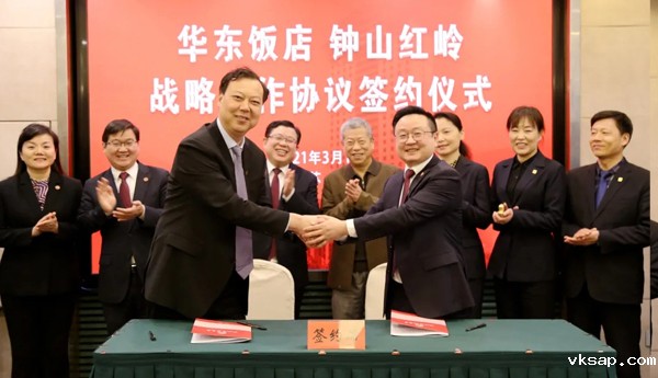 3月16日,钟山红岭与南京融通华东饭店战略合作协议签约仪式举行。根据协议,双方将在党性教育共建、党建标准化合作、党建阵地打造和职业能力提升等方面开展深度合作。钟山宾馆集团党委书记、董事长朱银生,党委副书记、总经理郑海龙,党委副书记王芳参加签约仪式。华东饭店党支部书记、筹备组组长袁际,集团党委委员、钟山红岭总经理胡俊代表双方签署战略合作协议。