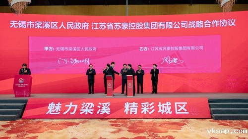 3月4日下午,苏豪控股集团与无锡市梁溪区人民政府在无锡隆重举行江苏苏豪(无锡)科创园项目战略合作签约仪式。苏豪控股集团党委书记、董事长王正喜与无锡市委书记黄钦进行座谈并出席签约仪式。控股集团总裁、党委副书记周勇,梁溪区委书记许立新分别在签约仪式上致辞。周谦副总裁,无锡市委常委、常务副市长朱爱勋参加签约活动。
