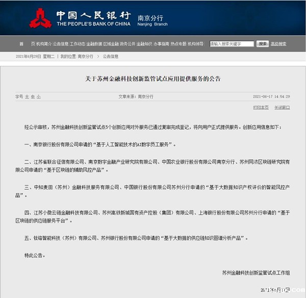 近日,中国人民银行南京分行发布苏州金融科技创新监管试点应用对外服务名单。江苏省联合征信有限公司申请的“基于区块链的辅助风控产品”通过复审,成为创新监管试点对外服务的5个应用之一,将正式向用户提供服务。