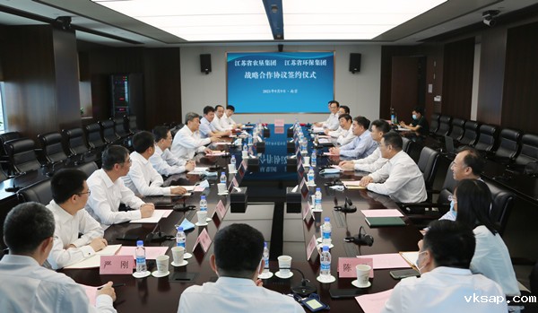 魏红军对方斌斌一行表示热烈欢迎。他表示,省环保集团是省属大型战略性环保产业集团、全省重点环境基础设施建设项目的省级投资主体,在全省环境治理体系中发挥重要作用,在技术创新综合服务领域拥有强大的技术储备与力量支持。他指出,近年来,省农垦集团坚持“守护绿色、奉献安全、服务健康”的理念,紧紧围绕“经济强、产业优、职工富、环境美、农场兴”的“新垦区建设目标,促进绿色低碳循环发展,以发展的“含绿量”体现发展的高质量。他强调,此次签署战略合作协议,是双方优势互补、强强联合的重要举措,也是落实美丽江苏建设的具体行动。双方将共同探索在源头治理与生态转型、政策咨询与技术指导、污染治理与项目建设、环境评估与评价、技术合作与能力提升等领域进行全面合作。期待双方发挥各自优势和强项,积极探索新机制、新路径,共同打造江苏省属企业高质量发展的合作典范和新时期生态文明建设的示范集群。