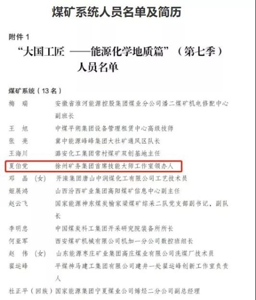 图为“大国工匠”——能化化学地质篇(第七季)人员名单,徐矿集团首席技能大师夏伯党名列其中