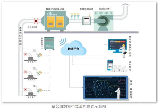 本项目旨在建设餐饮油烟综合治理“绿岛”,解决江阴市高新区芙蓉路、文化中路沿街80多家居民楼餐饮商户油烟异味扰民问题。项目共分二期建设,一期试点项目完成验收,二期项目已进入实施阶段。本项目的特点在于:1、采用集中式治理模式将餐饮单位油烟统一收集处理,形成服务于多个餐饮油烟排放主体的环境治理基础设施“绿岛”。2、采用变频调速运行和前馈式能耗管理系统降低系统运行能耗,系统能耗降低60%以上。3、采用负压抽吸和风量匹配控制技术,提高油烟收集效率,同步改善餐饮店内人员操作环境。4、采用双箱体隔声吸声设计、弹簧减震隔离等措施,杜绝噪声、振动等二次污染。5、处理后的油烟排放浓度<0.7mg/m³,优于最新的江苏省地标要求(1mg/m³)。6、搭建多方参与的大数据运维管控平台,形成政府主导多元共治的油烟治理运维体系和长效治理管控模式。7、工程公司江阴分公司作为公司本地化服务团队为本项目提供全方位支撑,助力地方管理部门解决沿街小型餐饮单位点位散、治理难、管控难、运维难的问题。