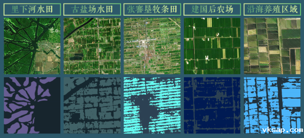 通过对现有资料的整理,集团初步锁定江苏沿海中部——盐城市大丰区,将沿海地区大地景观分为里下河水田-古盐场水田-垦牧条田-新中国成立后农场-沿海养殖区域五类。利用已识别的具有典型代表性的五类大地景观影像作为基础,向DeeplabV3+卷积神经网络喂给数据,经过200万次以上的训练后,达到95%以上的匹配率,证明分析结果准确性较高。