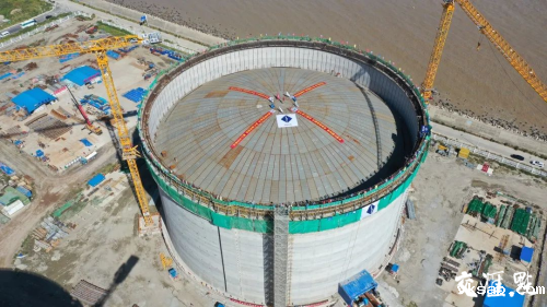 9月9日上午9时08分,如东洋口港阳光岛上风和日丽,随着现场总指挥一声令下,4台风机同时启动,江苏省液化天然气储运调峰项目一号储罐穹顶正式开始气顶升作业。11时38分,在全体参建人员共同努力下,重量达760吨、直径约86米的钢制穹顶平稳上升至42米高度,精确到达设计位置,与罐顶承压环完美契合,气顶升作业顺利完成。