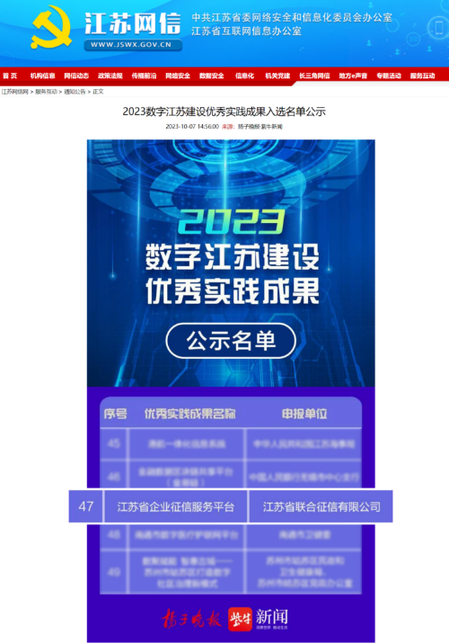 为深入贯彻习近平总书记关于网络强国的重要思想,贯彻落实省第十四次党代会有关部署,进一步宣传推广我省经济社会数字化转型发展和信息化驱动引领的成功经验和生动实践,奋力建设网络强省、数字江苏,省委网信办会同省发改委、省工信厅、省政务办以及省通信管理局共同举办“2023数字江苏建设优秀实践成果”评选活动。江苏省联合征信有限公司(以下简称省联合征信)建设运营的“江苏省企业征信服务平台”,经推荐、预审、专家评审及集中评议等环节,在全省270个案例中脱颖而出,成功入选“2023数字江苏建设优秀实践成果(数字经济类)”。