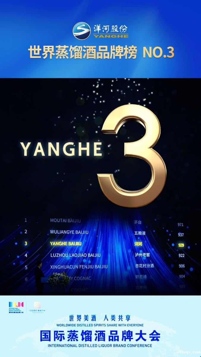 近日,“世界美酒·人类共享”国际蒸馏酒品牌大会在四川泸州举办,会上,《世界蒸馏酒品牌榜》和《中国白酒品牌价值榜》两项权威榜单发布,洋河凭借卓越的品质实力、品牌实力和国际影响力荣登世界蒸馏酒品牌榜第三名、中国白酒品牌价值榜第三名,品牌价值再攀世界新高度。