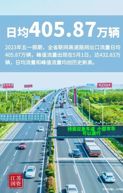 2023年五一假期,全省联网高速路网出口流量日均405.87万辆,峰值流量出现在假期第3天(5月1日),达432.83万辆,日均流量和峰值流量均创历史新高。江苏高速“一路三方”始终将服务公众出行作为首要职责,以最全面的应对、最健全的机制、最精准的策略,全力保障公众平安通行、快速畅行、温馨出行。假日期间,路网未出现长距离、长时间拥堵情况,总体运行平稳。