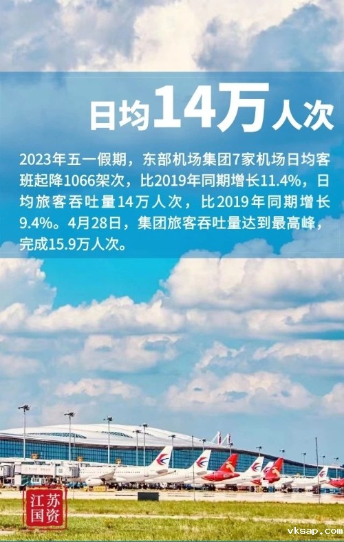 东部机场集团7家机场在4月28日至5月3日期间,日均客班起降1066架次,比2019年同期增长11.4%,日均旅客吞吐量14万人次,比2019年同期增长9.4%。4月28日,集团旅客吞吐量达到最高峰,完成15.9万人次,其中南京禄口国际机场继2019年8月份以来再次突破10万人次,达10.1万人次。境内客运市场恢复良好,集团日均境内旅客13.6万人次,比2019年同期增长18.3%。