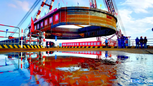 8月20日18时36分,在距离启东岸200米的长江入海口北支航道江面施工现场,随着两艘千吨级吊船平稳地将第一节钢围堰准确吊装就位,标志着世界在建最大跨度双塔双索面公铁两用无砟轨道斜拉桥——崇启公铁长江大桥北主塔墩首节钢围堰完成安装,北主塔正式转入大体积承台施工阶段。