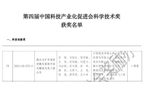 9月26日,中国科技产业化促进会印发《关于第四届中国科技产业化促进会科学技术奖奖励的决定》。由徐州铁矿集团有限公司、中钢集团马鞍山矿山研究总院股份有限公司、中钢集团安徽刘塘坊矿业有限公司、安徽铜冠池州资源有限公司、 武汉大学和上海迈格飞工程设计研究有限公司共同完成的项目《高应力矿井围岩控制与高效开采关键技术及工程应用》荣获科技创新奖二等奖。