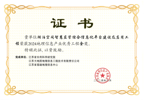 近日,江苏天地图地理信息工程技术有限责任公司承担实施的“湖泊空间智慧监管综合信息化平台建设及应用工程”项目荣获2024地理信息产业优秀工程金奖。