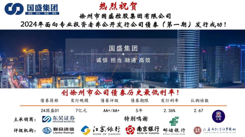 7月15日,徐州市国盛集团成功发行2024年非公开发行公司债券(第一期),规模7亿元,期限5年,票面利率2.36%,创徐州市公司债券发行利率历史最低。