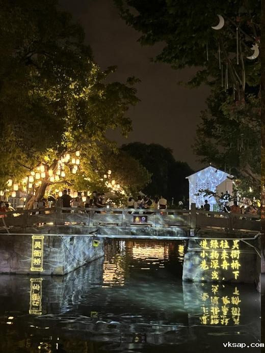 月色下,灯影斑驳,十全街的屋檐如翼,轮廓清晰,屋脊挺立,立柱坚固,以江南水乡建筑风貌为底色,不加过多修饰,尽显精美雅致。微风拂过,湖面涟漪荡漾,看亭上的姹紫嫣红开遍,昆曲悠扬,仿佛时间凝固,让人沉醉于这宁静而古朴的水乡画卷之中。光影交织,网红打卡点璀璨夺目;投影舞星空,风格独特辨识高,激光闪烁,光束交错,十全街地标熠熠生辉,古今交融,将商业艺术气息完美地融合在了这古色生香的街头巷尾中。
