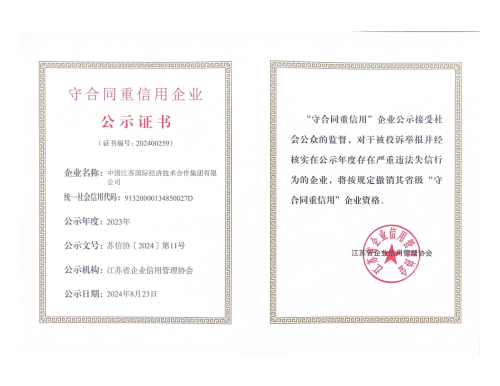 日前,中江国际集团收到江苏省企业信用管理协会颁发的2023年度省级“守合同重信用”企业公示证书,这是集团自2021年度以来蝉联该称号。
