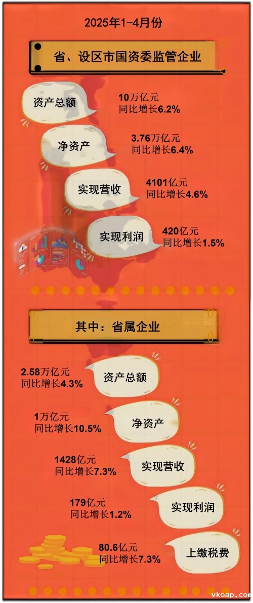 1-4月份,省、设区市国资委监管企业资产总额10万亿元、净资产3.76万亿元,同比分别增长6.2%、6.4%。