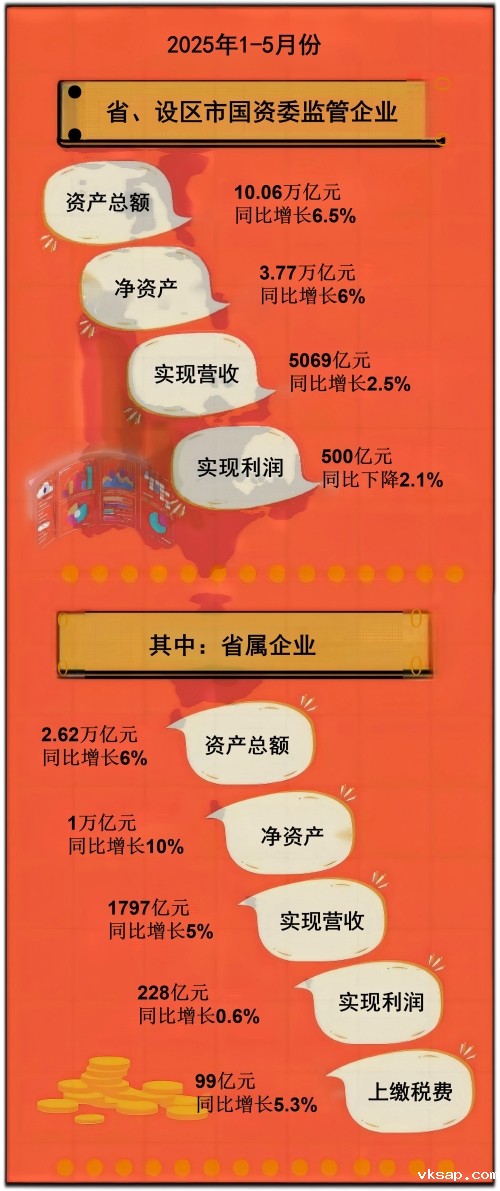 1-5月份,省、设区市国资委监管企业资产总额10.06万亿元、净资产3.77万亿元,同比分别增长6.5%、6%。